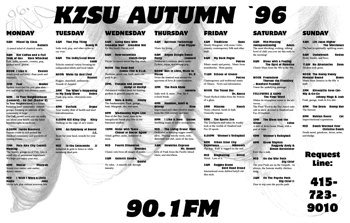 A functional list of the current KZSU schedule, text-only, can be found here.